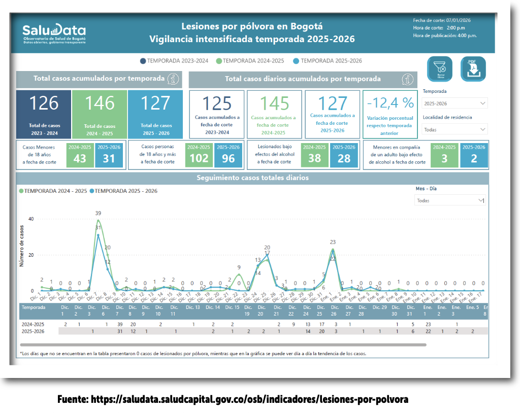 En Bogotá, la vigilancia en salud pública de las lesiones por pólvora pirotécnica reporta que, para la temporada de fin de año 2025-2026 (corte 10 de enero de 2026), se han notificado un total acumulado de 131 casos, lo que representa una disminución del 10,27 % respecto al mismo periodo del año anterior (2024-2025), cuando se reportaron 146 casos. Los días con mayor número de incidentes fueron el 7, 8 y 25 de diciembre de 2025, así como el 1 de enero de 2026. De los 131 casos reportados, 99 ocurrieron en mayores de 18 años y 32 en población menor de edad.