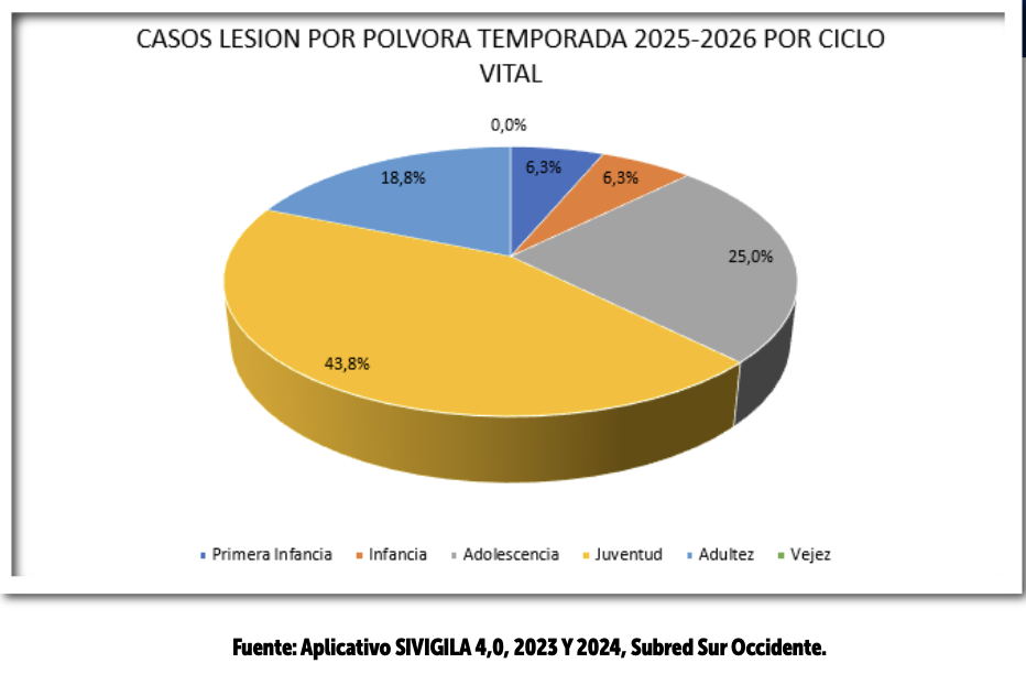Por otro lado, en la Subred Sur Occidente, la vigilancia en salud pública reporta que, para la misma temporada (corte 10 de enero de 2026), se notificaron 16 casos, aumentando con respecto al año anterior, cuando se registraron 13 casos. Los días con mayor número de incidentes fueron el 8 y 25 de diciembre de 2025 y el 1 de enero de 2026.