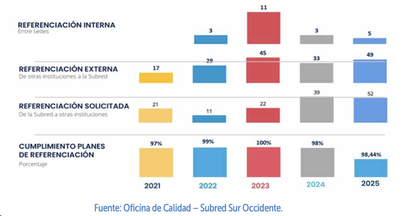 Durante esta vigencia se registraron 5 referenciaciones internas entre sedes, 49 externas desde otras instituciones hacia la Subred y 52 solicitudes hacia otras entidades. Estos resultados reflejan un aumento frente a años anteriores y se acompañan de un cumplimiento del 98,44 % en los planes de referenciación, evidenciando una gestión eficiente y sostenida en el tiempo.