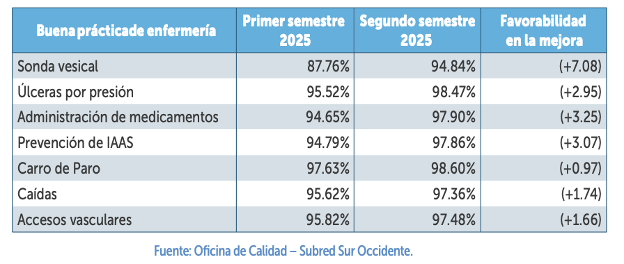 Así mismo, en el área de enfermería se evidenciaron avances significativos en la adherencia a protocolos, como sonda vesical (del 87,76% al 94,84%) y úlceras por presión (98,47%). De igual forma, prácticas clave como la administración de medicamentos, la prevención de IAAS y el manejo de carros de paro alcanzaron niveles de cumplimiento superiores al 97,8%, fortaleciendo la cultura de seguridad del paciente.