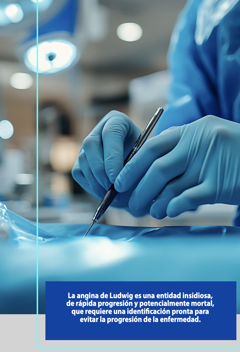 La angina de Ludwig, descrita inicialmente en 1836 por el médico alemán Wilhelm Fredrich Von Ludwig, es una infección poco común y una urgencia quirúrgica causada por estreptococos y/o bacterias anaerobias que provoca una celulitis gangrenosa progresiva, rápida y mortal del espacio submandibular, sublingual y submentoniano, caracterizada por su propensión a extenderse rápidamente a los tejidos circundantes. La etiología más frecuente es de origen odontogénico; sin embargo, otras posibles causas son absceso periamigdalino, fractura mandibular, lesión penetrante en el suelo de la boca, osteomielitis mandibular, otitis media, perforación lingual y sialolitiasis de las glándulas submandibulares (1).